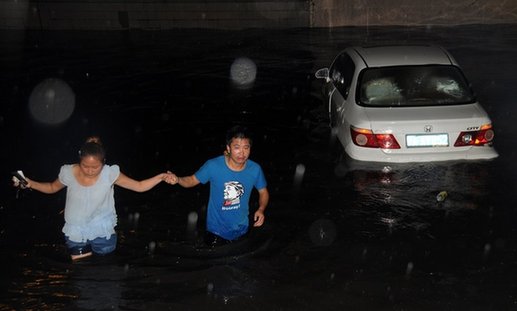 7月30日,銀川市黃河路鐵路橋下,市民從被困車中走出