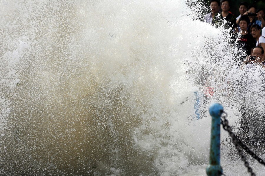 8月2日,青島棧橋附近,游客在岸上觀看大浪。