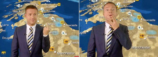 BBC氣象主播節(jié)目中對同事豎中指被電視直播 2010年7月,BBC著名氣象主播托馬斯·謝佛內(nèi)克在節(jié)目現(xiàn)場向另一位主播豎中指,結(jié)果被攝像機(jī)逮了個正著,引起嘩然。當(dāng)天,在和老搭檔西蒙·麥考伊及菲奧娜·阿姆斯特朗一起主持早間新聞節(jié)目時,托馬斯·謝佛內(nèi)克趁播報(bào)的空檔向麥考伊豎起了自己的中指。做完這個不雅手勢后,謝佛內(nèi)克突然意識到自己正對著攝像機(jī)。然而,為時已晚,觀看這檔早間節(jié)目的觀眾均