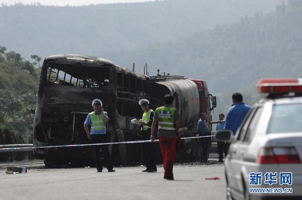 圖為包茂高速陜西延安境內(nèi)發(fā)生的特大交通事故現(xiàn)場(8月26日攝)。