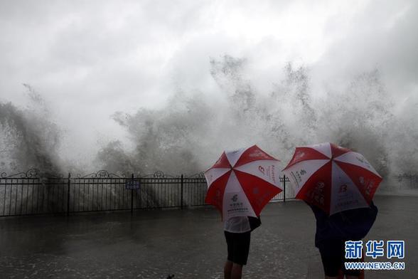 8月28日,市民在山東威海海港公園海邊觀看狂風(fēng)掀起的巨浪。當(dāng)日,受今年第15號(hào)臺(tái)風(fēng)“布拉萬(wàn)”影響,山東沿海地區(qū)迎來(lái)大風(fēng)暴雨天氣,海邊掀起巨浪。
