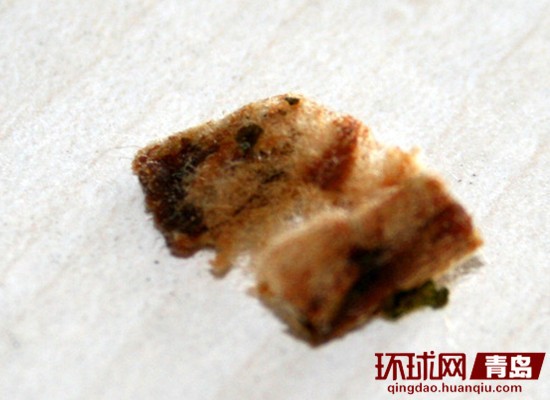 ????隨后,趙先生開始食用煮好了的面,“我感覺泡面里也有煙味,所以我就在碗中來回攪拌,結(jié)果發(fā)現(xiàn)了一塊‘牛肉丁’,散發(fā)著煙味。”趙先生表示,他將這塊“牛肉丁”挑出來撕開,發(fā)現(xiàn)其呈絲絮狀,內(nèi)部為深黃色,部分已經(jīng)發(fā)黑,煙油味很濃,“確定是香煙的過濾嘴,而且還是抽過的,真是太惡心了?!彪S后,趙先生又把方便面包裝袋拿過來一聞,沒有聞到煙味,而調(diào)料包里的煙味卻很濃,他認為過濾嘴就是被包裝在調(diào)料包里的。