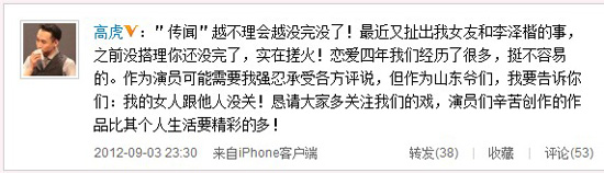 一直對(duì)傳聞保持緘默的高虎終于在微博上打破了沉默,回應(yīng)了近日甚囂塵上的傳聞,霸氣地稱(chēng)自己的女人與他人沒(méi)關(guān),“傳聞越不理會(huì)越?jīng)]完沒(méi)了!最近又扯出我女友和李澤楷的事,之前沒(méi)搭理你還沒(méi)完了,實(shí)在搓火!戀愛(ài)四年我們經(jīng)歷了很多,挺不容易的。作為演員可能需要我強(qiáng)忍承受各方評(píng)說(shuō),但作為山東爺們,我要告訴你們:我的女人跟他人沒(méi)關(guān)!懇請(qǐng)大家多關(guān)注我們的戲,演員們辛苦