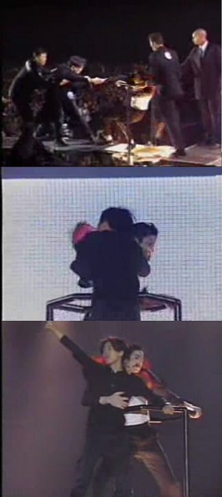 邁克爾杰克遜在韓國(guó)演出時(shí),一男直接沖上臺(tái),把正在演唱的杰克遜突然嚇到,為了他的安全,杰克遜一直抱著他。而該男則緊緊抱著杰克遜不放,表情極其猥瑣。