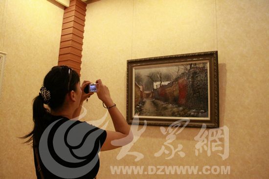 采訪團(tuán)成員在青島綠澤油畫國際展覽交易中心里參觀。(記者 張帆攝)