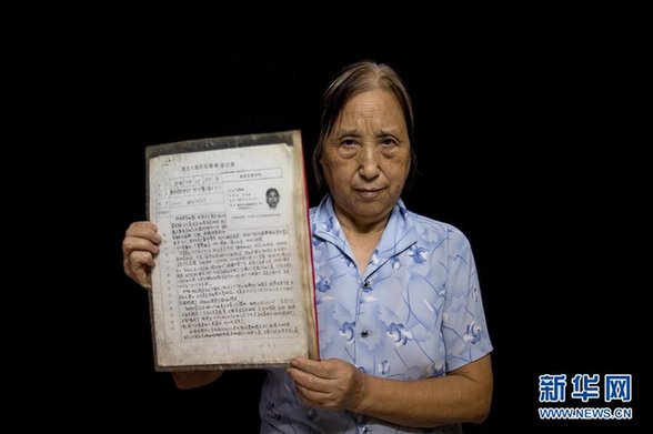 2012年9月12日,重慶,76歲的王邦俐老人,拿出受害者登記錄,高喊還我公道。王邦俐,女,生于:1938年8月8。出生地:九龍坡區(qū),籍貫:重慶市,受難日期:1939年6月。家及“同心電料行”的商店炸毀,母親在躲避轟炸的途中眼睛受了傷,臉也腫了,雖然經過簡單的治療,但視力越來越差,由于無錢繼續(xù)治療,左眼就失明了,右眼也只有微弱的光感。