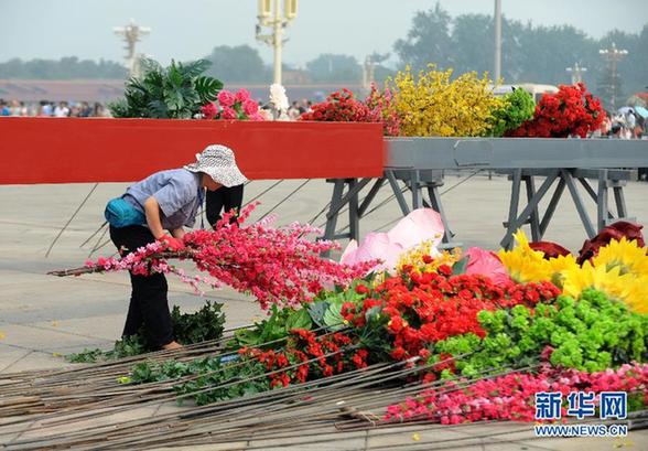 9月22日,工人在裝飾天安門廣場國慶主花壇。當日,北京天安門廣場國慶主花壇從組裝地正陽門移至天安門廣場北側(cè)中心,安放在“祝福祖國”的基座上。據(jù)了解,直徑達11米,約兩層樓高的天安門廣場國慶主花壇將在當晚基本裝飾完成。
