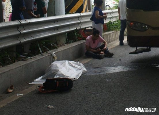 高先生說,兩人在橋下放好行李后等車,小娟在路旁吃早餐。7時18分時,他看到了要搭乘的紫金車,于是招手攔車,大巴以極快的速度靠邊時朝他倆撞了過來,他閃身躲避成功,而女朋友則被大巴撞上后頂在護欄上,并頂了4米遠。圖為事發(fā)現(xiàn)場。