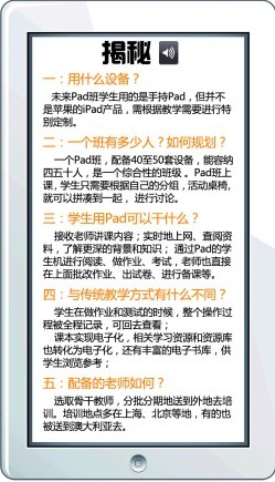 ????而對(duì)于配備的教師資源,“我們自然是先從老師抓起?!崩罱鸢l(fā)介紹,雖然還沒有建成Pad班,但是相關(guān)教師已經(jīng)開始培訓(xùn)。
