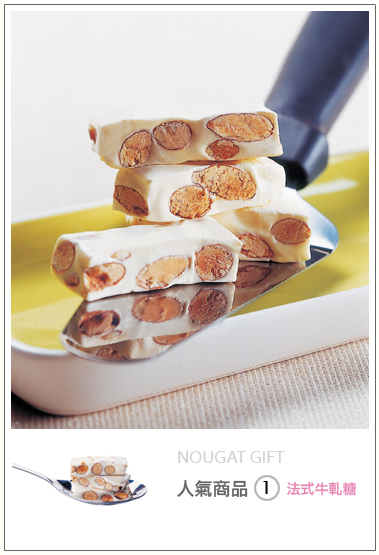 法式牛軋?zhí)牵安徽撃逃?、杏仁、麥芽糖,都?huì)要求要選用頂級(jí)食材,才能做出最好吃的牛軋?zhí)恰!币话闩\執(zhí)羌訜o(wú)鹽奶油,本次將展出用法國(guó)有鹽奶油,引出糖的甜味,吃了又不會(huì)膩口的牛軋?zhí)?;杏仁特別挑選小而渾圓的品種,經(jīng)3小時(shí)大火烤、小火燜兩道程序,吃起來(lái)又香又脆;而麥芽混合了褐色與透明兩種風(fēng)味,再由受熱均勻的銅鍋低溫熬煮,每個(gè)環(huán)節(jié)都要求完美,糖因此軟Q好吃,一定要來(lái)品嘗。