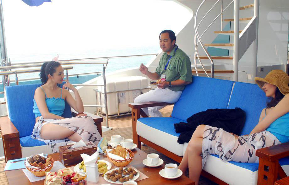 2010年3月19日,陪同參加2010博鰲國(guó)際旅游論壇·??谟瓮Ы?jīng)濟(jì)主題論壇貴賓試乘國(guó)際豪華游艇的新絲路模特在游艇與貴賓一起就餐。
