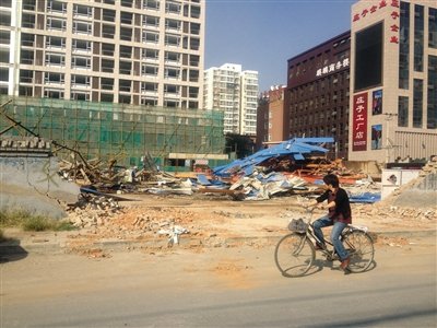 昨日,一名路人騎車經(jīng)過被毀的工地。昨日凌晨,地鐵10號(hào)線二期成壽寺站至宋家莊站區(qū)間一工地被強(qiáng)行毀壞,井架等施工設(shè)備被砸壞,多棟塑鋼房被徹底推平,施工公司稱損失上百萬(wàn)。新京報(bào)記者陳博攝