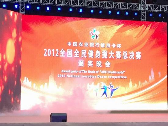 ????2012“中國(guó)農(nóng)業(yè)銀行信用卡杯”全國(guó)全民健身操大賽總決賽閉幕式暨頒獎(jiǎng)典禮在青島大學(xué)體育館舉行。