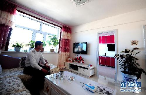 阿爾山林業(yè)局職工王剛在伊爾施鎮(zhèn)天元小區(qū)明亮溫暖的新家里看電視(10月26日攝)。自2009年國家實施國有林區(qū)棚戶區(qū)改造工程以來,內(nèi)蒙古大興安嶺森工集團積極籌措資金,著力改善林區(qū)職工生活條件。目前,內(nèi)蒙古大興安嶺林區(qū)棚戶區(qū)改造已完成投資30多億元,有59177戶近15萬林業(yè)職工和家屬告別低矮、破舊的“板夾泥”土房遷入新居。新華社記者任軍川 攝