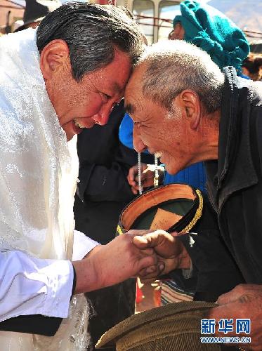 10月27日,在達(dá)孜縣,曾經(jīng)找李素芝治過病的平措老人與李素芝(左)行碰頭禮。 10月27日,被藏族群眾稱為“門巴將軍”(醫(yī)生將軍)的李素芝又一次來到拉薩墨竹工卡縣和達(dá)孜縣藏族農(nóng)村和寺廟,給僧俗群眾看病送藥,受到群眾的歡迎。常年深入邊關(guān)、農(nóng)村、牧區(qū)巡診已經(jīng)成為李素芝生活的一種常態(tài)。李素芝說:“黨的十八勝利召開前夕,作為一名老黨員,更要以實(shí)際行動(dòng)把黨的光輝撒進(jìn)廣大藏族同胞心田,才不辜負(fù)黨的培