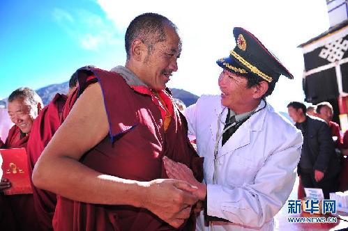 10月27日,“門巴將軍”李素芝在墨竹工卡縣為僧人看病。 10月27日,被藏族群眾稱為“門巴將軍”(醫(yī)生將軍)的李素芝又一次來到拉薩墨竹工卡縣和達(dá)孜縣藏族農(nóng)村和寺廟,給僧俗群眾看病送藥,受到群眾的歡迎。常年深入邊關(guān)、農(nóng)村、牧區(qū)巡診已經(jīng)成為李素芝生活的一種常態(tài)。李素芝說:“黨的十八勝利召開前夕,作為一名老黨員,更要以實(shí)際行動(dòng)把黨的光輝撒進(jìn)廣大藏族同胞心田,才不辜負(fù)黨的培養(yǎng)和關(guān)愛