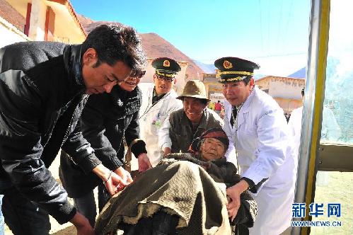 10月27日,“門(mén)巴將軍”李素芝(右一)在達(dá)孜縣幫助轉(zhuǎn)運(yùn)群眾。 10月27日,被藏族群眾稱(chēng)為“門(mén)巴將軍”(醫(yī)生將軍)的李素芝又一次來(lái)到拉薩墨竹工卡縣和達(dá)孜縣藏族農(nóng)村和寺廟,給僧俗群眾看病送藥,受到群眾的歡迎。常年深入邊關(guān)、農(nóng)村、牧區(qū)巡診已經(jīng)成為李素芝生活的一種常態(tài)。李素芝說(shuō):“黨的十八勝利召開(kāi)前夕,作為一名老黨員,更要以實(shí)際行動(dòng)把黨的光輝撒進(jìn)廣大藏族同胞心田,才不辜負(fù)黨的培養(yǎng)和關(guān)