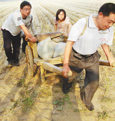 派駐村官和大學生村官們在幫助留守老人收割小麥(劉肖坤 攝)