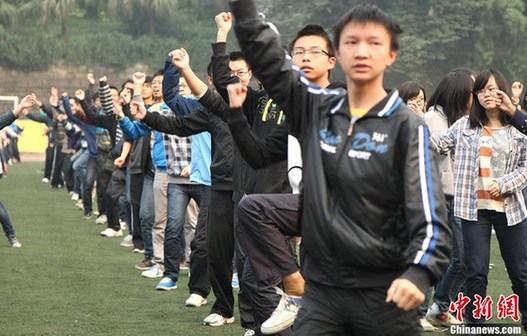 11月2日,重慶南開中學(xué)課間操上,學(xué)生們?cè)隗w育老師的帶領(lǐng)下,在操場(chǎng)上興奮的跳著《最炫民族風(fēng)》。前不久,全校課間操學(xué)生齊跳《江南style》的南開中學(xué)又玩起了新花樣,課間操曲子換成了《最炫民族風(fēng)》。