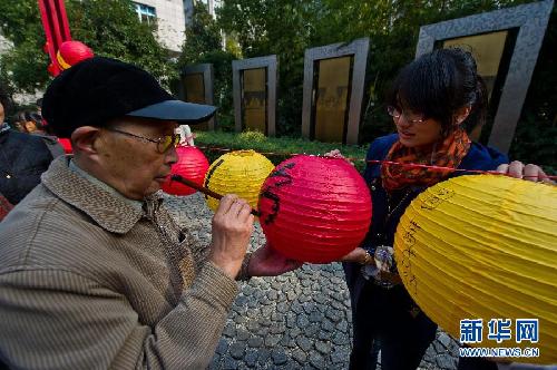 當(dāng)日,杭州市西溪街道文教社區(qū)與浙江工商大學(xué)50多位師生在社區(qū)內(nèi)一起制作手工燈籠,寫上對(duì)十八大、對(duì)黨、對(duì)祖國(guó)的祝福。新華社記者徐昱攝