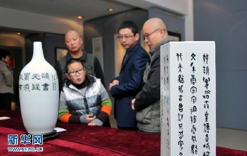 ????當日,為慶祝黨的十八大召開,江西省景德鎮(zhèn)仲安畫廊舉行景德鎮(zhèn)青年陶瓷書法作品展。此次活動由景德鎮(zhèn)市青年聯(lián)合會、景德鎮(zhèn)青年書畫家協(xié)會和景德鎮(zhèn)高等??茖W校陶瓷文化藝術中心聯(lián)合主辦,展出當?shù)?3位陶藝家的100件陶瓷書法作品。新華社發(fā)(石衛(wèi)明 攝)