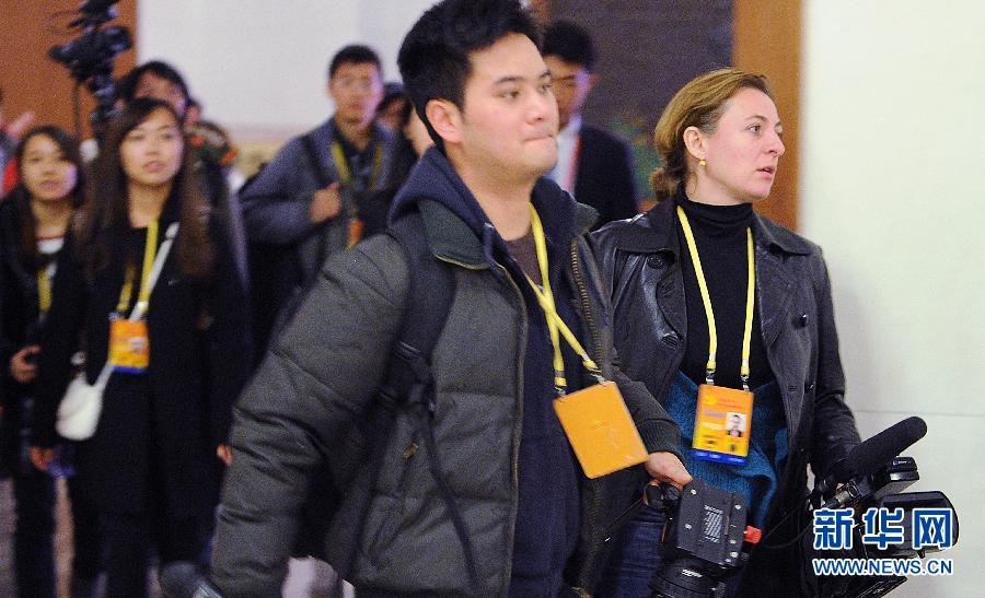 11月14日,中國共產(chǎn)黨第十八次全國代表大會閉幕會在北京人民大會堂舉行。 這是記者準(zhǔn)備入場采訪。 新華社記者張巖攝