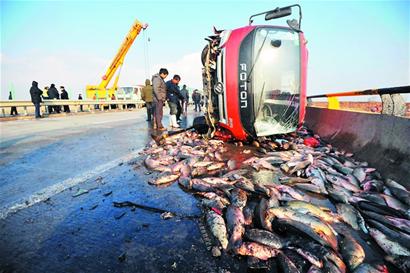 橋面薄冰還引發(fā)了對向車道的事故,一輛拉著5噸活魚的貨車原地轉了180°,然后側翻在高速路應急車道上,5噸活魚頓時將路面鋪滿?!棒~和機油全混一塊了,沒法吃了,損失十萬元。 ”