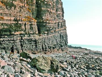 作為一座火山島,靈山島地質(zhì)獨(dú)特。在白堊紀(jì)早期,受地殼動(dòng)蕩、后期褶皺和斷裂影響,形成了一系列雄奇險(xiǎn)峻的地質(zhì)景觀。由于海上風(fēng)浪太大,不少奇石在這一天都被海水淹沒,但在肖永軍的指引下,記者還是有幸近距離地觀賞一億三千多萬(wàn)年才形成的自然奇觀——千層壁。據(jù)肖永軍介紹,經(jīng)過地質(zhì)專家的勘探,這處崖壁形成的原因是在白堊紀(jì)造山運(yùn)動(dòng)非常劇烈,經(jīng)過大??駶О偃f(wàn)年來的沖擊,深入水中的部分?jǐn)嗔殉蔀楹V械慕甘0毒统霈F(xiàn)了這道壯觀的海蝕崖壁。近年來吸引了越來越多的游客前來觀光,也吸引了很多國(guó)內(nèi)外的地質(zhì)愛好者前來勘探研究。