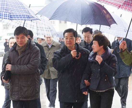 ????12月26日至29日,國家主席胡錦濤來到江蘇考察工作,看望慰問干部群眾,向大家致以新年的美好祝福。這是胡錦濤在鹽城市恒北村考察時為講解的村支書打傘。(新華社記者 李學(xué)仁 攝)