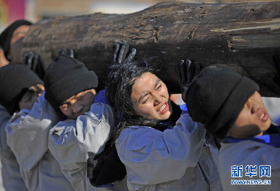 韋佳佳和隊(duì)友進(jìn)行圓木挺舉和左右換肩訓(xùn)練,800斤左右的圓木,她和另10名隊(duì)友完成100個(gè)托舉動(dòng)作。