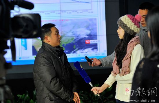 圖為“奶茶妹妹”在采訪南京市氣象局負(fù)責(zé)人。 南報網(wǎng)記者 朱皓杜文雙攝