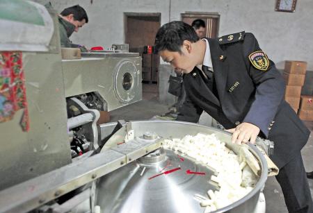 糖果生產(chǎn)場內(nèi),生產(chǎn)原料就擺放在地上,工人從原料邊走過?! 【鶠樾鞖g 石禎專 攝影報道 執(zhí)法人員在清理非法生產(chǎn)的糖果。 ????牛奶糖,顧名思義,里面總好歹得有些牛奶、奶粉、奶油之類的吧。1月23日,跟隨長沙市質監(jiān)局年貨生產(chǎn)專項整治組到黎托打黑窩點,記者才知道,原來一些人生產(chǎn)的“牛奶糖”,只需要淀粉+糖漿+香精即可。 ????“牛奶糖”里沒有牛奶 ????這家生產(chǎn)“牛奶糖”的黑窩點位于黎托川河,位置隱蔽,大門緊閉。執(zhí)法人員用力推開大鐵門,幾個工人正在封閉的大倉庫里操作。執(zhí)法人員突然而至,嚇了他們一大跳,趕緊停止操作,一個個找機會溜走。 ????一個姓黃的婦女據(jù)稱是老板,尚未來得及離開,被執(zhí)法人員認了出來,“怎么又是你??!”長沙市質監(jiān)局副局長張煉告訴記者:“現(xiàn)在正是年關,是糖果的銷售旺季,為了賺上一筆,一些沒有辦證的不良商販就采取打游擊的方式,到處租房子偷偷生產(chǎn)?!?/p> ????整個倉庫彌漫著濃郁的奶香,然而執(zhí)法人員找遍所有角落都沒看到半點含牛奶、奶粉、奶油成分的原材料。他們的產(chǎn)品是如何生產(chǎn)的?執(zhí)法人員在垃圾車邊找到了麥芽糖漿,在被熏得黑糊糊的炭灶上看到一鍋正在熬制的糖水,兩個污濁不堪的塑膠桶里裝著用來熬制的糖漿的水,膠桶上的文字表明,這兩個桶子以前是用來裝柴油、機油的;混合淀粉和糖漿的糖果胚子正在鍋子里熬制,在地上擺放著大團糖胚,還有一團就隨意扔在一個堆放著臟衣服、黑棉絮的架子上。 ????使用假冒QS證 ????執(zhí)法人員發(fā)現(xiàn),這家為自己所有貨品貼上“味美思”廠名的黑窩點,其QS證早在2010年就被取消,現(xiàn)在使用的均為假冒QS證。記者還發(fā)現(xiàn),老板用知名品牌“大白兔”、“旺仔”牛奶糖相似的包裝紙包裝自己的產(chǎn)品,并為自己的糖粒子取名“小白兔”奶糖和“萬仔”奶糖。 ????除了端掉這家糖果生產(chǎn)黑窩點,昨天市質監(jiān)局還在黎托潭陽社區(qū)取締一家生產(chǎn)兒童小食品“薯條沙拉”、“芝麻棒”的黑窩點,該窩點無證生產(chǎn),假冒QS證,現(xiàn)場生產(chǎn)條件惡劣。 ????據(jù)悉,這些問題食品主要流入了高橋、黎托附近小超市以及部分周邊縣。張煉表示,會聯(lián)合工商盡快將流入市場的問題食品追查回來。他也提醒市民,在采購糖果等年貨時,可登錄湖南省質監(jiān)局官方網(wǎng)站,進入QS證書查詢系統(tǒng)查詢其生產(chǎn)許可證信息。 ????新聞花絮 ????黎托房東:你們莫拍 ????拍了以后怎么出租 ????在昨天端掉兩個黑窩點的行動現(xiàn)場,都不約而同出現(xiàn)了黑窩點的房東。在生產(chǎn)兒童小食品“薯條沙拉”、“芝麻棒”的黑窩點,一名中年男子氣勢洶洶地攔住了扛著照相機、攝像機的媒體隊伍,“你們莫拍咯,你拍了,我以后還怎么租房子出去啊?!?/p> ????而在那家“小白兔”、“萬仔”糖果黑窩點,兩名男子拉住執(zhí)法人員,低聲抱怨說:“你們這樣一來執(zhí)法,老板等下一跑,我找誰要租金去啊?!睂τ趫?zhí)法人員來查黑窩點,房東比工人還要“不滿”。 ????一位男子告訴記者,他們這樣一個300多平方米的倉庫,一年可獲得租金4萬元左右。 ????(編輯:湯云佩) |