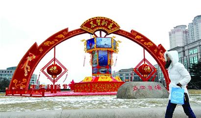 ????昨日,一名市民從五四廣場剛搭建完成的巨型拱門前走過,紅彤彤的福字拱門營造出喜慶的節(jié)日氛圍。