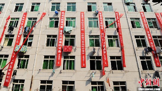 3月7日是被眾多高校大學(xué)生譽(yù)為“女生節(jié)”的日子,當(dāng)日,中南大學(xué)鐵道學(xué)院男生和女生宿舍前掛起的多條橫幅格外醒目,男生們用這種特殊的方式祝賀女生節(jié)日快樂(lè)。圖為男生宿舍掛起的二十多條橫幅。(楊華峰 攝)