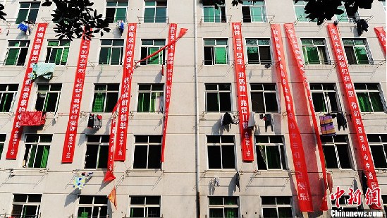 3月7日是被眾多高校大學(xué)生譽(yù)為“女生節(jié)”的日子,當(dāng)日,中南大學(xué)鐵道學(xué)院男生和女生宿舍前掛起的多條橫幅格外醒目,男生們用這種特殊的方式祝賀女生節(jié)日快樂(lè)。圖為男生宿舍掛起的二十多條橫幅。(楊華峰 攝)