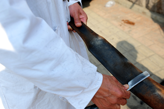 現(xiàn)在這種剃刀已經(jīng)很少有人會用了,沒個幾十年的手藝很容易傷人。張力偉 攝