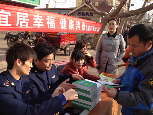 ????2013年3月9日上午,黃島工商所工作人員開(kāi)展3.15主題宣傳活動(dòng)。在黃島國(guó)貨商廈門(mén)前,工作人員通過(guò)懸掛3.15活動(dòng)主題“宜居幸福、健康消費(fèi)”橫幅,發(fā)放《消費(fèi)維權(quán)手冊(cè)》、《山東省消費(fèi)者權(quán)益保護(hù)條例》等形式,宣傳消費(fèi)維權(quán)知識(shí),解答群眾關(guān)心的熱點(diǎn)、難點(diǎn)問(wèn)題?;顒?dòng)現(xiàn)場(chǎng)共發(fā)放宣傳材料98份,解答群眾疑問(wèn)60余次。 |