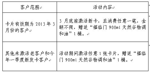 ????凡一季度符合我行獎勵標準的河北銀行信用卡持卡人,除享受原有積分優(yōu)惠的同時,更可獲得“福臨門天然谷物調(diào)和油”。一樣的刷卡,不一樣的精彩。還不趕快辦卡,享受專屬于您的滋味春天。