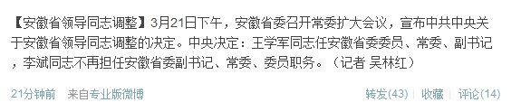 ????據(jù)《安徽日?qǐng)?bào)》法人微博消息,3月21日下午,安徽省委召開(kāi)常委擴(kuò)大會(huì)議,宣布中共中央關(guān)于安徽省領(lǐng)導(dǎo)同志調(diào)整的決定。中央決定:王學(xué)軍同志任安徽省委委員、常委、副書(shū)記,李斌同志不再擔(dān)任安徽省委副書(shū)記、常委、委員職務(wù)。