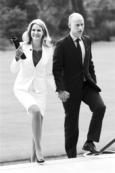 2012年7月27日,丹麥現(xiàn)任女首相赫勒·托寧·施密特同丈夫斯蒂芬·金諾克前往英國(guó)白金漢宮,拜訪英國(guó)女王伊麗莎白二世。