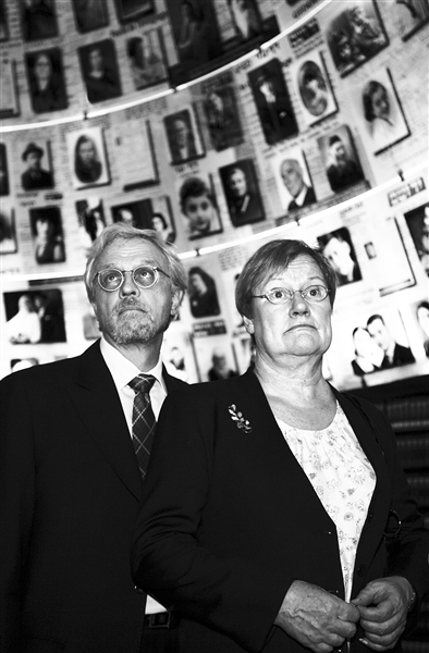 ?、?010年10月12日,芬蘭時(shí)任女總統(tǒng)塔里婭·哈洛寧與男友阿拉亞爾維造訪位于耶路撒冷的猶太人大屠殺紀(jì)念館。