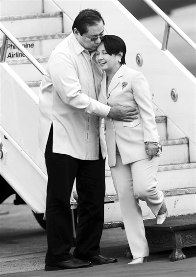 ?、?006年5月11日,時(shí)任菲律賓女總統(tǒng)阿羅約在馬尼拉機(jī)場(chǎng)受到丈夫圣·米古爾的歡迎。