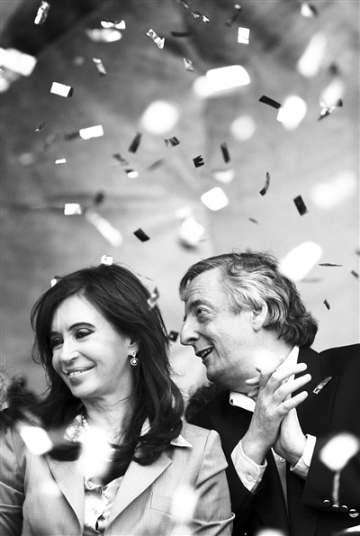 ④2009年12月15日,阿根廷現(xiàn)任女總統(tǒng)克里斯蒂娜·費(fèi)爾南德斯及其丈夫基什內(nèi)爾(曾擔(dān)任阿根廷總統(tǒng),于2010年10月27日心臟病逝世)參加集會(huì),慶??ㄜ囁緳C(jī)節(jié)。