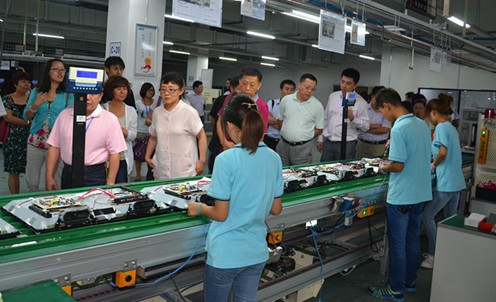 ????冠捷科技(青島)有限公司為冠捷集團和華通集團共同出資建設的顯示器設備生產(chǎn)企業(yè),廠房采用了綠色環(huán)保的設計理念,為二星級綠色建筑,整潔開闊的工作環(huán)境和井然有序的生產(chǎn)流程給人耳目一新的感受。劉甘霖副書記、范建軍副總經(jīng)理率隊首先參觀了液晶電視的裝配車間,他們仔細觀摩了工人在流水線上的組裝過程,聽取了冠捷科技相關(guān)人員對工廠管理以及銷售情況的介紹。