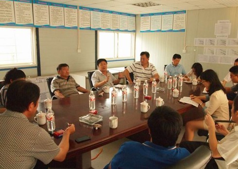 ????王磊董事長參觀了客房樣板間,隨后,在工地會(huì)議室中召開會(huì)議。他聽取了新時(shí)代房地產(chǎn)公司、華僑國際飯店以及集團(tuán)隨行人員對(duì)樣板間的意見建議,并對(duì)項(xiàng)目下一步工作提出了具體要求。