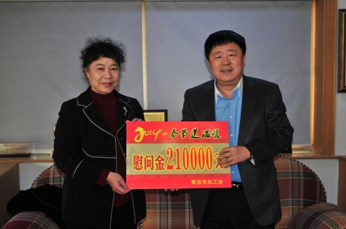 ????2014年1月3日,青島市總工會常務(wù)副主席蔡琦帶領(lǐng)市總有關(guān)部門來華通集團走訪慰問,帶來慰問金21萬元,用于春節(jié)期間慰問集團所屬困難企業(yè)和困難職工。集團黨委書記、董事長王磊,黨委副書記、副總經(jīng)理劉民,黨委副書記、工會主席劉甘霖及有關(guān)部門參加了活動。