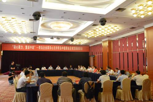 ????2014年7月3日下午,“凝心聚力,重返中超”企業(yè)家關(guān)心支持青島中能職業(yè)足球發(fā)展座談會(huì)在市級(jí)機(jī)關(guān)會(huì)議中心舉行。會(huì)議由市足球協(xié)會(huì)主席周鵬舉主持,青島市副市長(zhǎng)欒新,程友新、孔心田、馬倫業(yè)等市老領(lǐng)導(dǎo),市體育局局長(zhǎng)紀(jì)高尚,青島中能足球俱樂(lè)部董事長(zhǎng)喬偉光,華通集團(tuán)王磊董事長(zhǎng)以及青島部分企業(yè)家代表出席了會(huì)議。