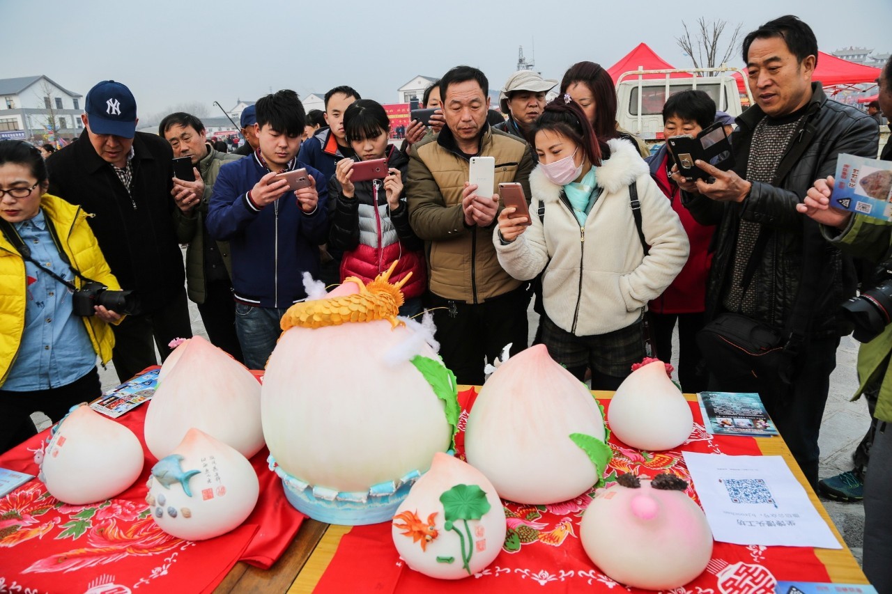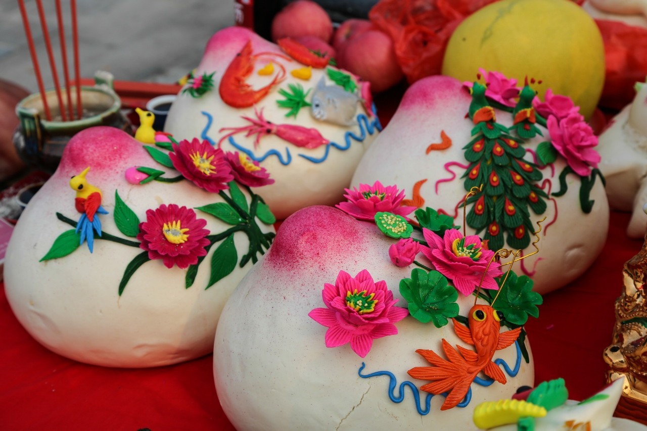 祭海首要的是蒸面塑。面塑的重量一般在兩公斤以上,傳統(tǒng)的造型有壽桃,如今婦女們又在壽桃上設(shè)計(jì)了梅花、牡丹、盤龍等飾物,用各種顏色繪上油彩,造型十分生動(dòng)。