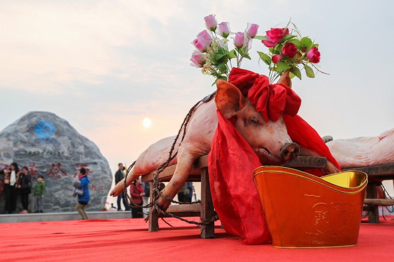 再是選三牲:豬、雞、魚。豬以黑毛公豬為佳,越大越好,宰殺后刮毛,只留豬脖上一撮黑毛,并用紅綢布打結(jié)而成的紅花帶披掛在豬頭和豬脖子上。雞要選個(gè)頭大的紅公雞,魚要用大個(gè)的鱸魚。