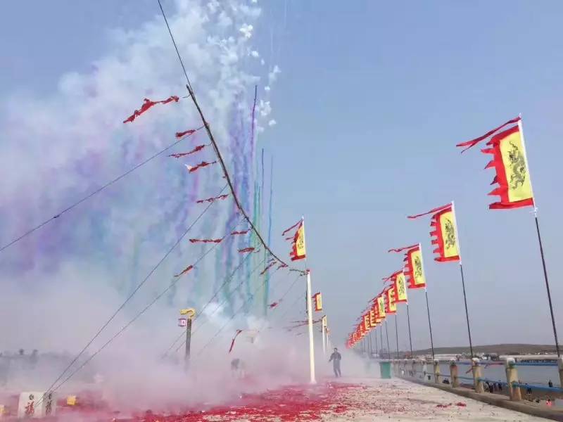 上千掛鞭炮在海灘邊一字排開,良辰吉時(shí)一到,鞭炮齊鳴、鑼鼓喧天。